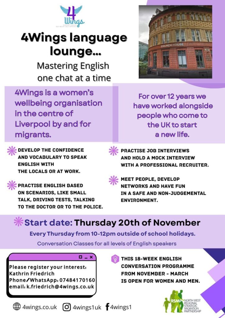 4Wings 係一間由移民女性成立、服務全體社群嘅關懷機構,喺利物浦紮根逾 12 年。今次會話班 男女皆可參加,內容實用到貼地: