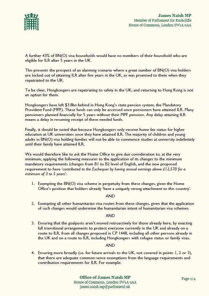 Naish 強調,BN(O) 簽證以跨黨派支持誕生,係回應香港自由受壓後嘅需要,無應該喺終點前「移龍門」。佢哋要求內政部豁免BN(O)及其他人道路線不受新規硬性影響;同時提供完整過渡保障,確保所有已在英國嘅申請人不被追溯加辣;並設常識式豁免,對長者、殘疾人士、學生、照顧者/家庭主婦、以及透過志願服務、家庭照顧或關鍵工種等方式作出貢獻者,給予合理安排;亦建議承認英語授課/研究學位作語文能力證明,毋須額外B2考試。