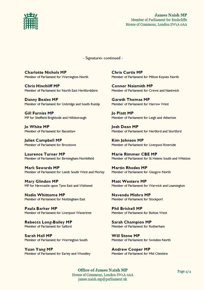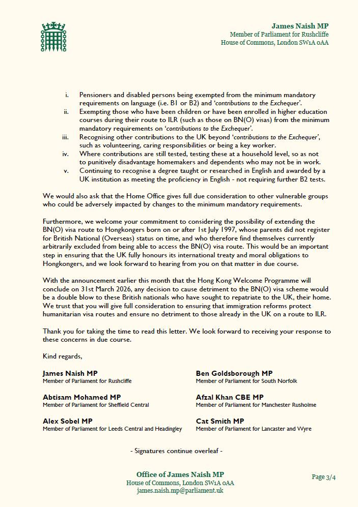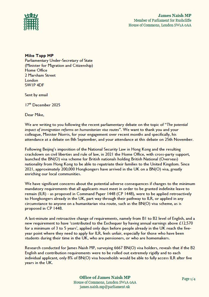 英國工黨議員 James Naish(Rushcliffe) 聯同 33 位工黨同僚,去信 移民與公民事務副國務卿 Mike Tapp MP,延續其就「移民改革對人道簽證路線嘅潛在影響」所作嘅國會辯論。信中關注《Command Paper 1448(CP1448)》提出把英語要求由 B1 提升到 B2,並加入以「對國庫有貢獻」衡量(例如連續三至五年年收入高於 £12,570)等最低強制要求。若硬性而且追溯套用喺已身處英國、正走五年定居(ILR)途中的BN(O)家庭,會同當年政府對BN(O)路線「五年可申請定居」嘅清晰承諾相違。