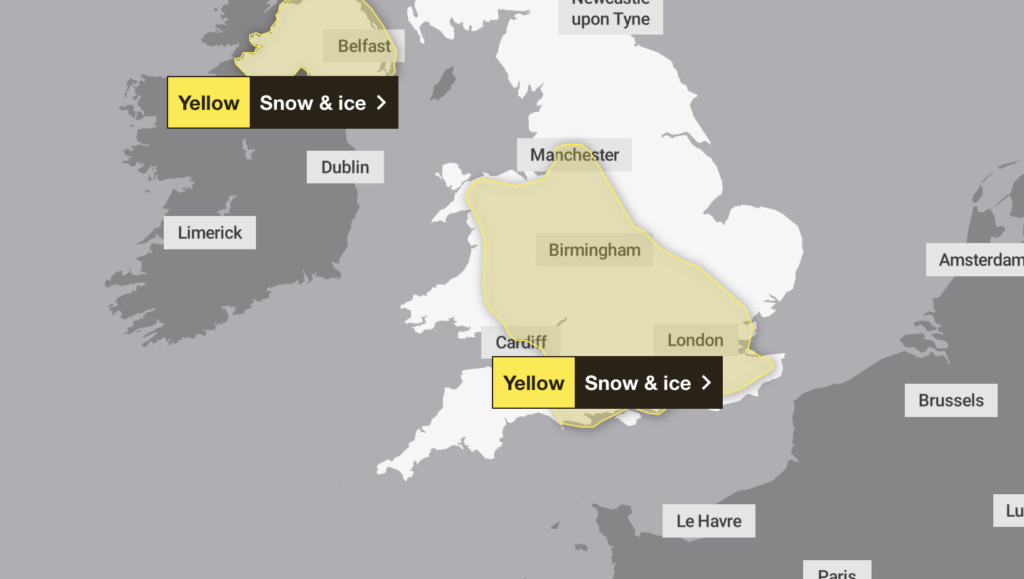 英國氣象局發出黃色天氣警告(雪與結冰),生效時間改為二〇二六年一月二日凌晨零時至中午十二時(本地 GMT/UTC)。一條夾雜雨夾雪(sleet)與雪的帶狀系統,會自西北向東南掃過,每一地區停留約兩至三小時。落雪處常見一至二厘米積雪,高地如北威爾斯、英格蘭西北與或涉西北米德蘭,局部點位或達五厘米。系統通過後氣溫仍低,濕地迅速結成薄冰,未處理的人行道、次要道路與單車道會變得滑不留腳。