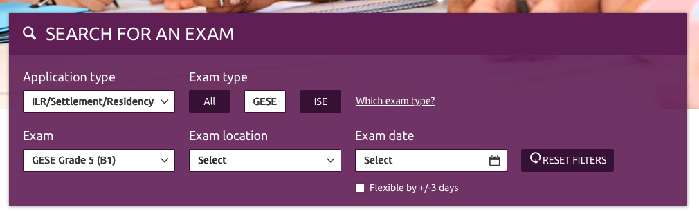 可以直接到 Trinity 官方報名頁面:https://www.trinitycollege.com/book-exam#selt 。進入頁面後,先點選「Secure English Language Tests (SELT) – Book Now」,系統會帶你進入考試類型選擇頁。Application type 請選擇 ILR,Exam type 揀 GESE,而具體考試就選 GESE Grade 5(B1)。